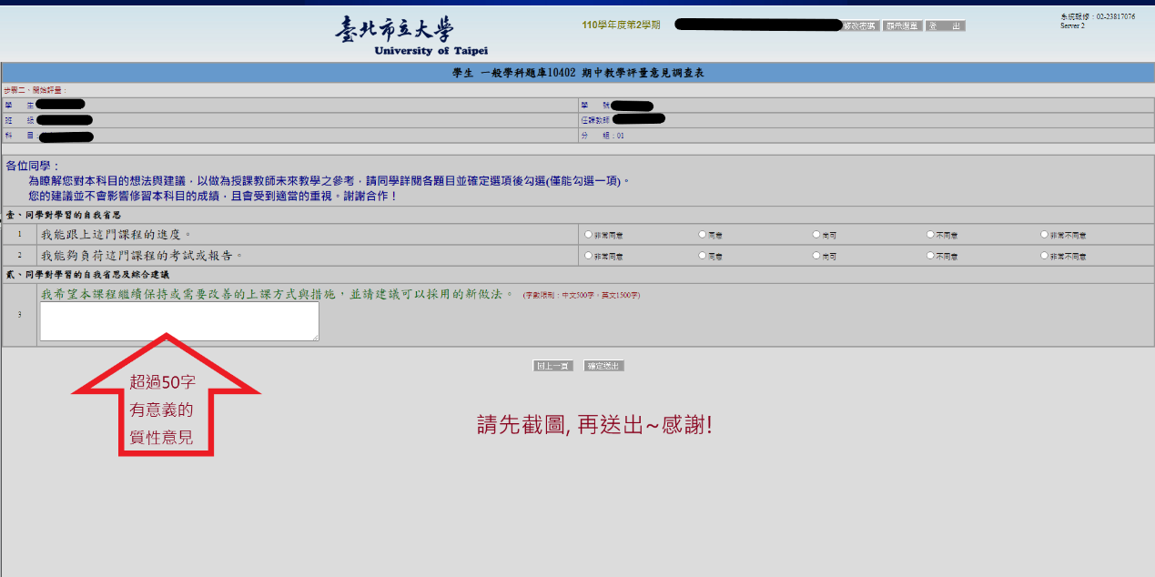 ★送出前請務必截圖有質性意見文字內容的頁面(如下方圖示,因本調查為匿名性),再持此截圖至教學發展中心領取禮券。
